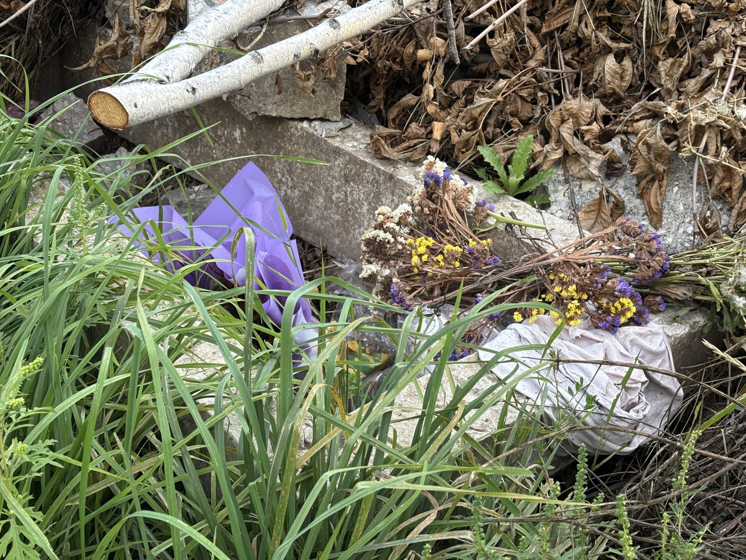 Ми ходили по старому кладовищу близько години. Найбільшу концентрацію нових поховань бачимо в самому його кінці. Тут же бачимо величезні купи сміття. Підійшовши ближче, помічаємо, що серед торішнього листя, зів’ялих букетів та «вічнозелених» пластмасових вінків, осиротіло лежать викинуті старі могильні плити та огорожі.