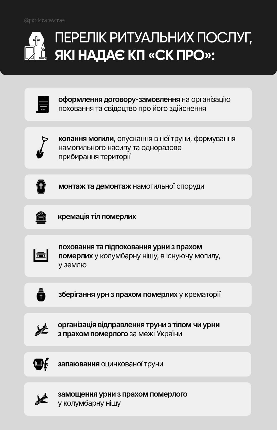 За порядком на кладовищах Полтавської громади стежить Комунальне підприємство «Спецкомбінат похоронно-ритуального обслуговування» міськради. Загалом, нині в них на балансі 91 кладовище. Проте, «розселення» людей та наведення порядку на цвинтарях міста — далеко не вичерпний перелік завдань підприємства. КП «СК ПРО» також надає мінімальний перелік ритуальних послуг, а саме: